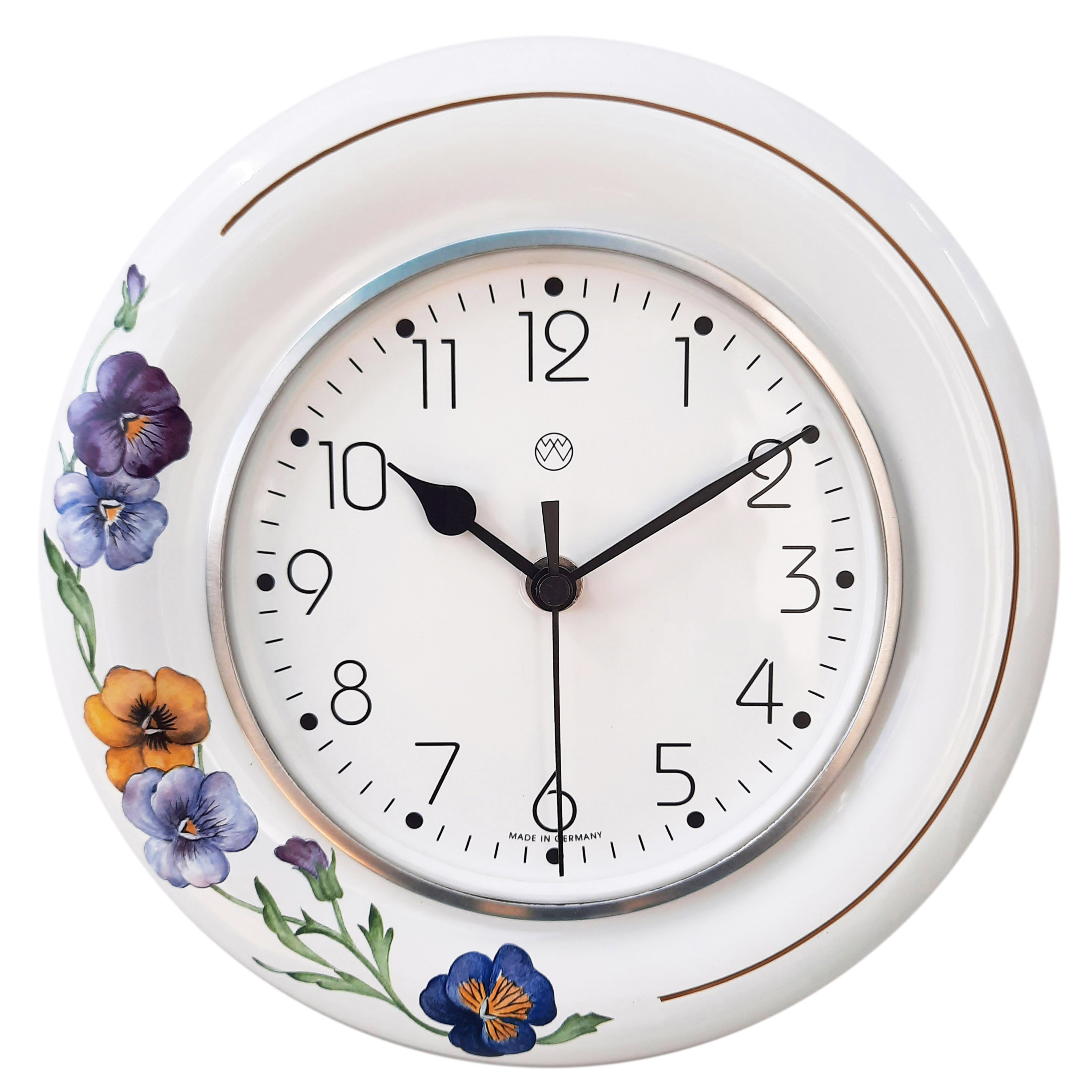 Funk-Küchenuhr, rundes weißes Keramik-Gehäuse, Aluglasrand, Mineralglas, Dekoration Handarbeit, Dekor / Stiefmütterchen, Funkwerk, schwarze Herzzeiger.
