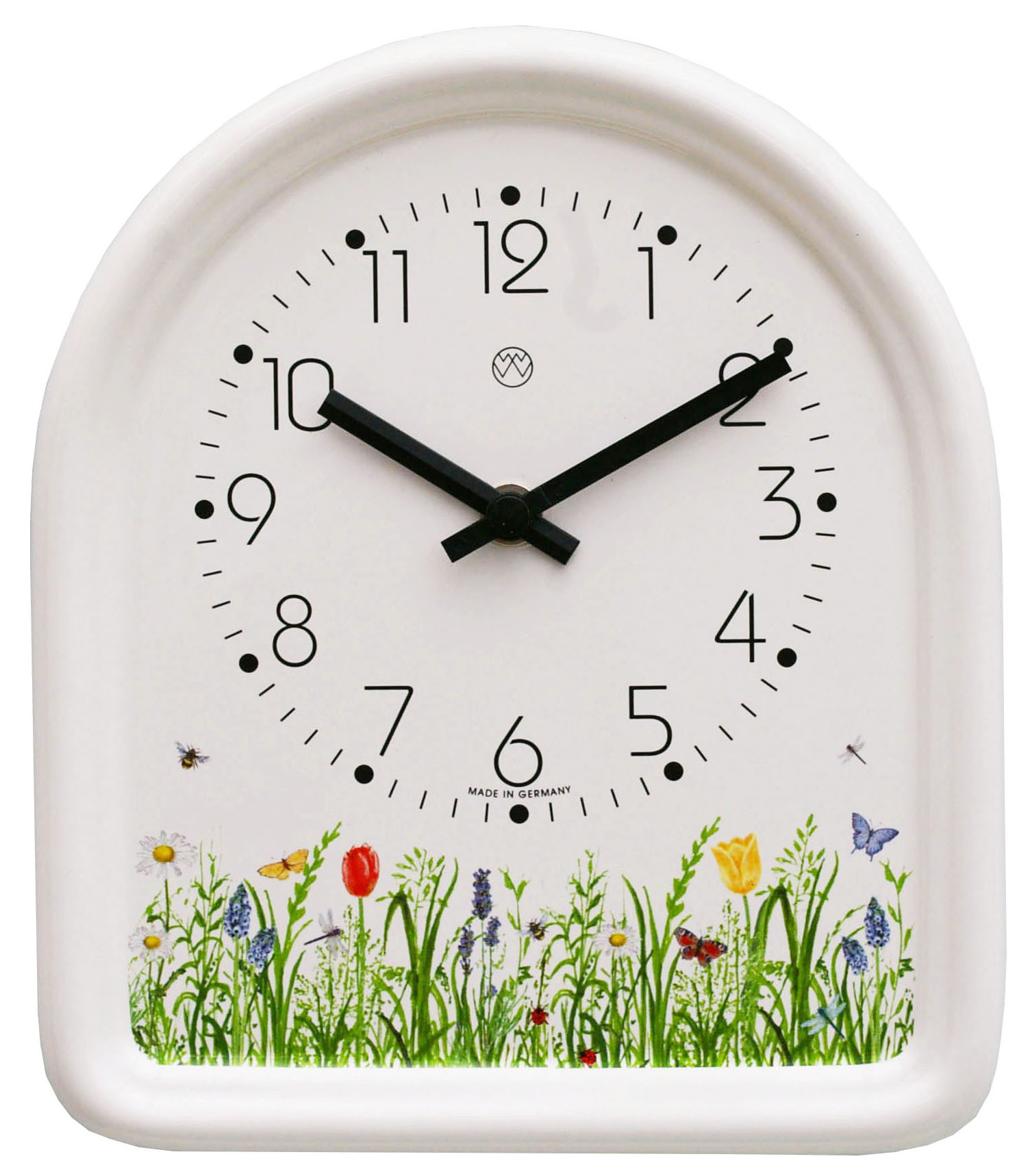 Keramik-Uhr, weißes Keramik-Gehäuse, Dekoration Handarbeit, Dekor / Frühling, Quarzwerk, schwarze Zeiger.
