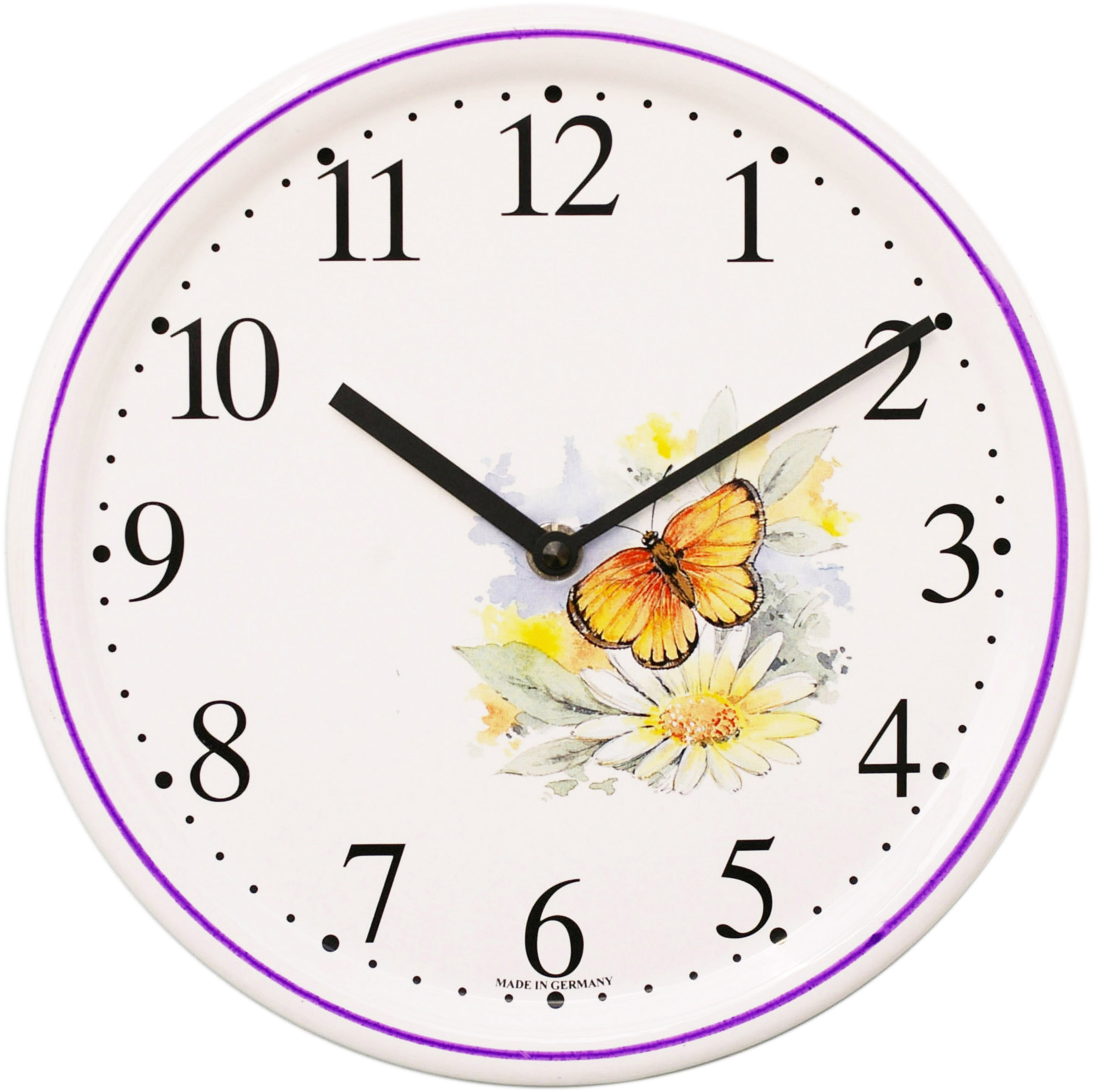 Keramik-Uhr, weißes rundes Keramik-Gehäuse mit Dekorrand, Dekoration und Malerei Handarbeit, Dekor / Schmetterling gelb, Quarzwerk, schwarze Zeiger.