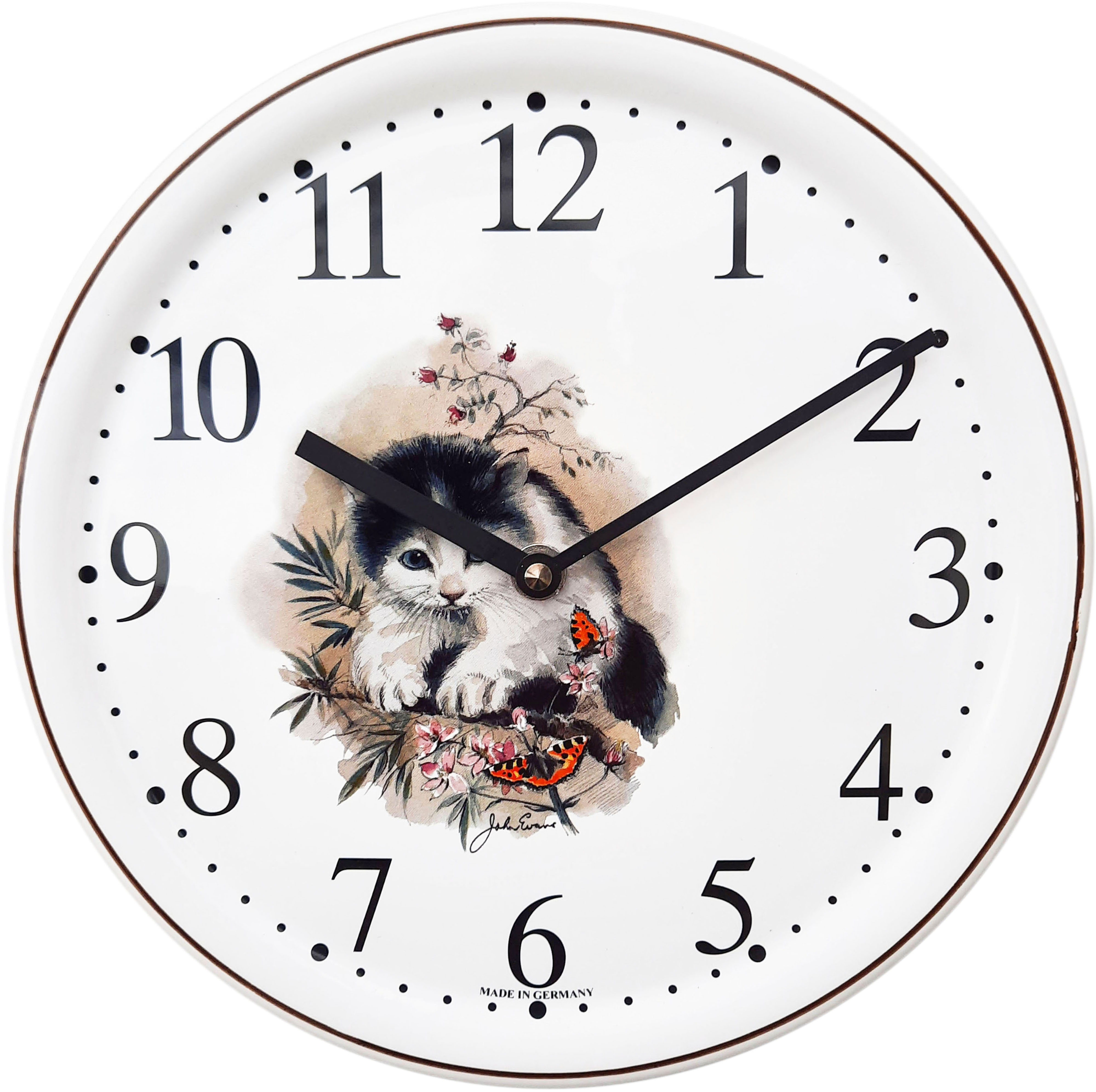 Keramik-Uhr, weißes rundes Keramik-Gehäuse mit Dekorrand, Dekoration und Malerei Handarbeit, Dekor / Katze, Qaurzwerk, schwarze Zeiger: