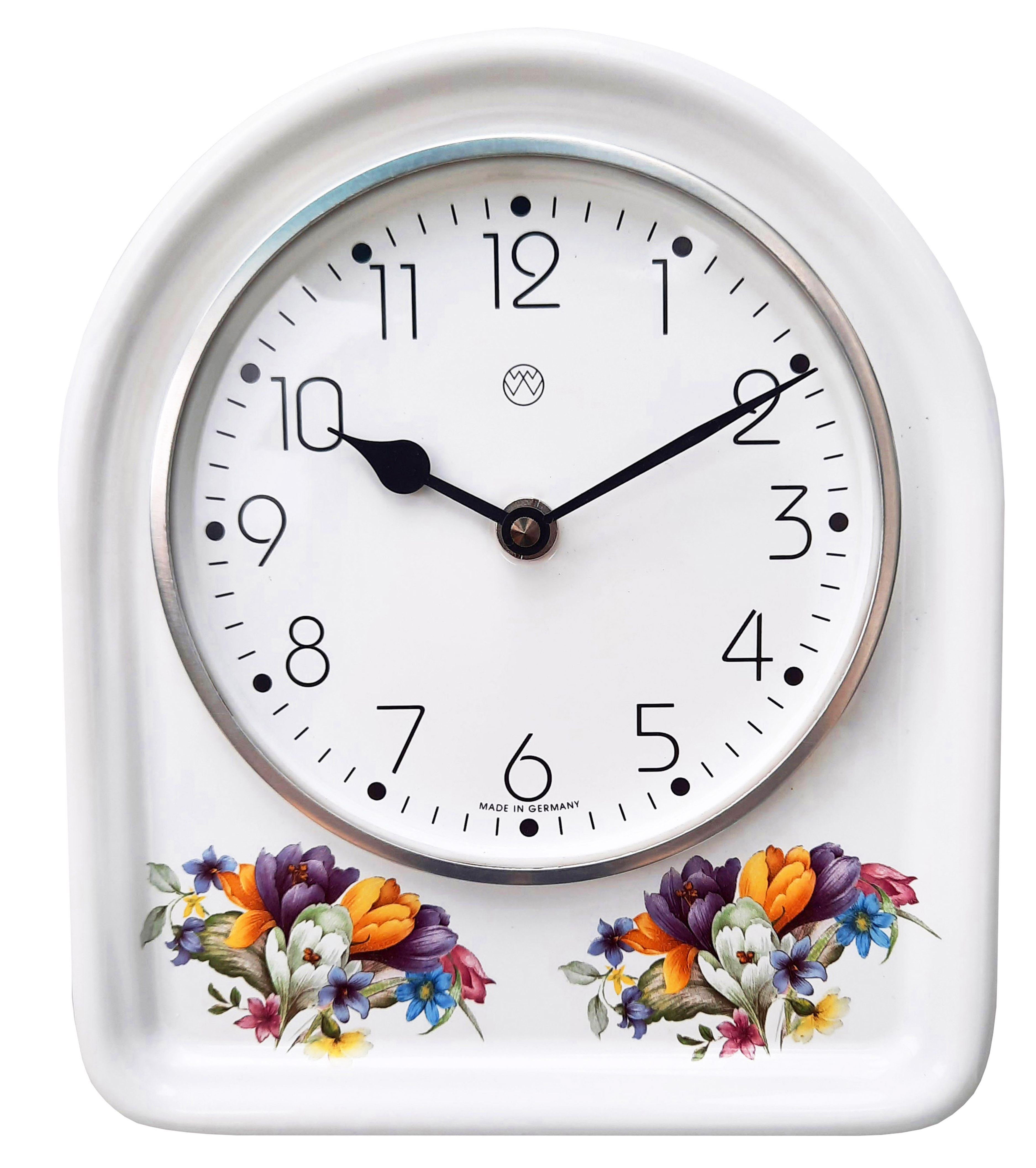 Quarz-Küchenuhr, weißes Keramik-Gehäuse, Dekoration Handarbeit, Mineralglas, Aluglasring, Dekor / Krokusse, Quarzwerk, schwarze Herzzeiger.