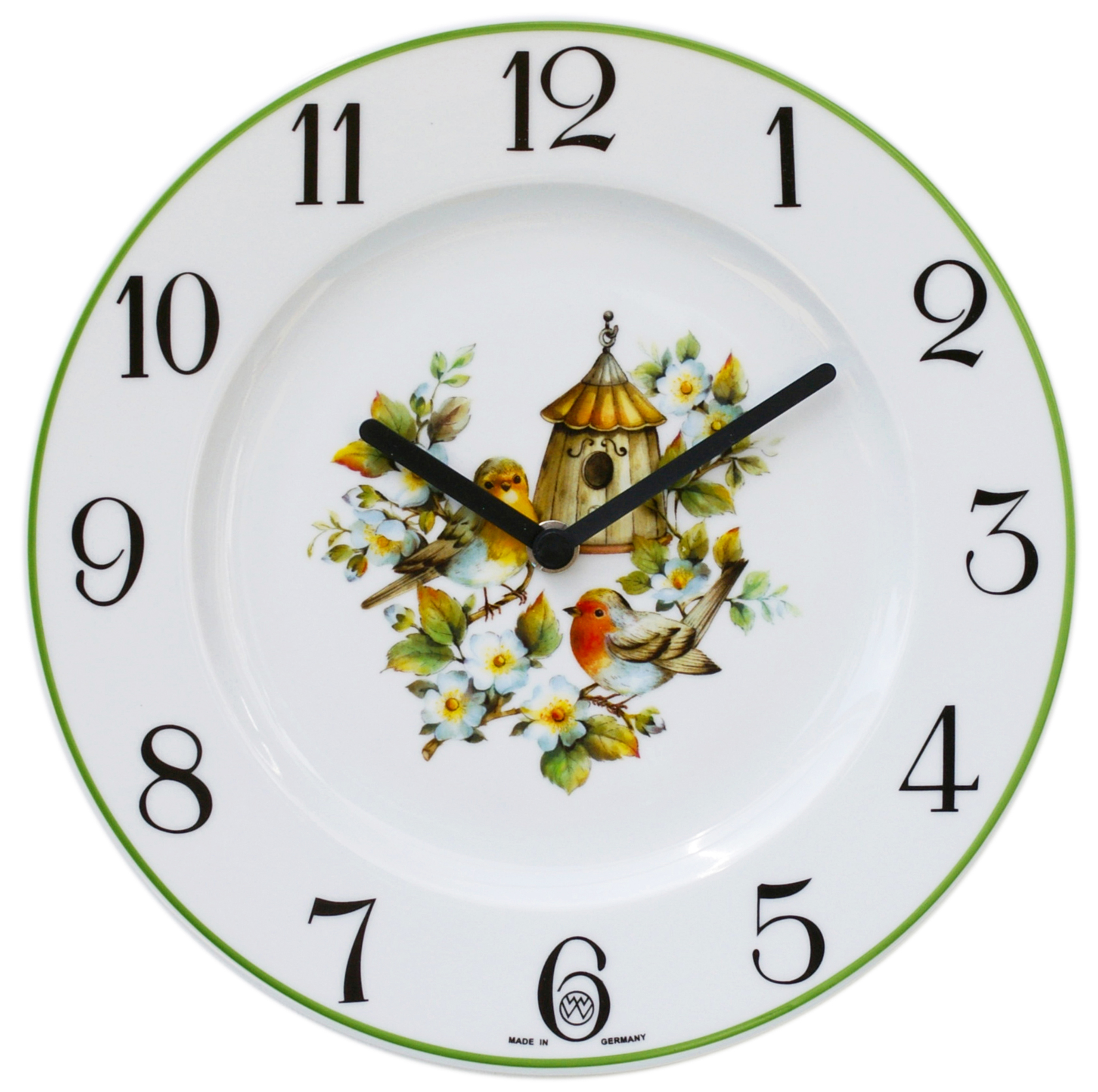 Telleruhr aus Porzellan, Dekoration und Malerei Handarbeit, Dekor / Vogelhaus mit grünen Dekorrand, Quarzwerk, schwarze Zeiger.